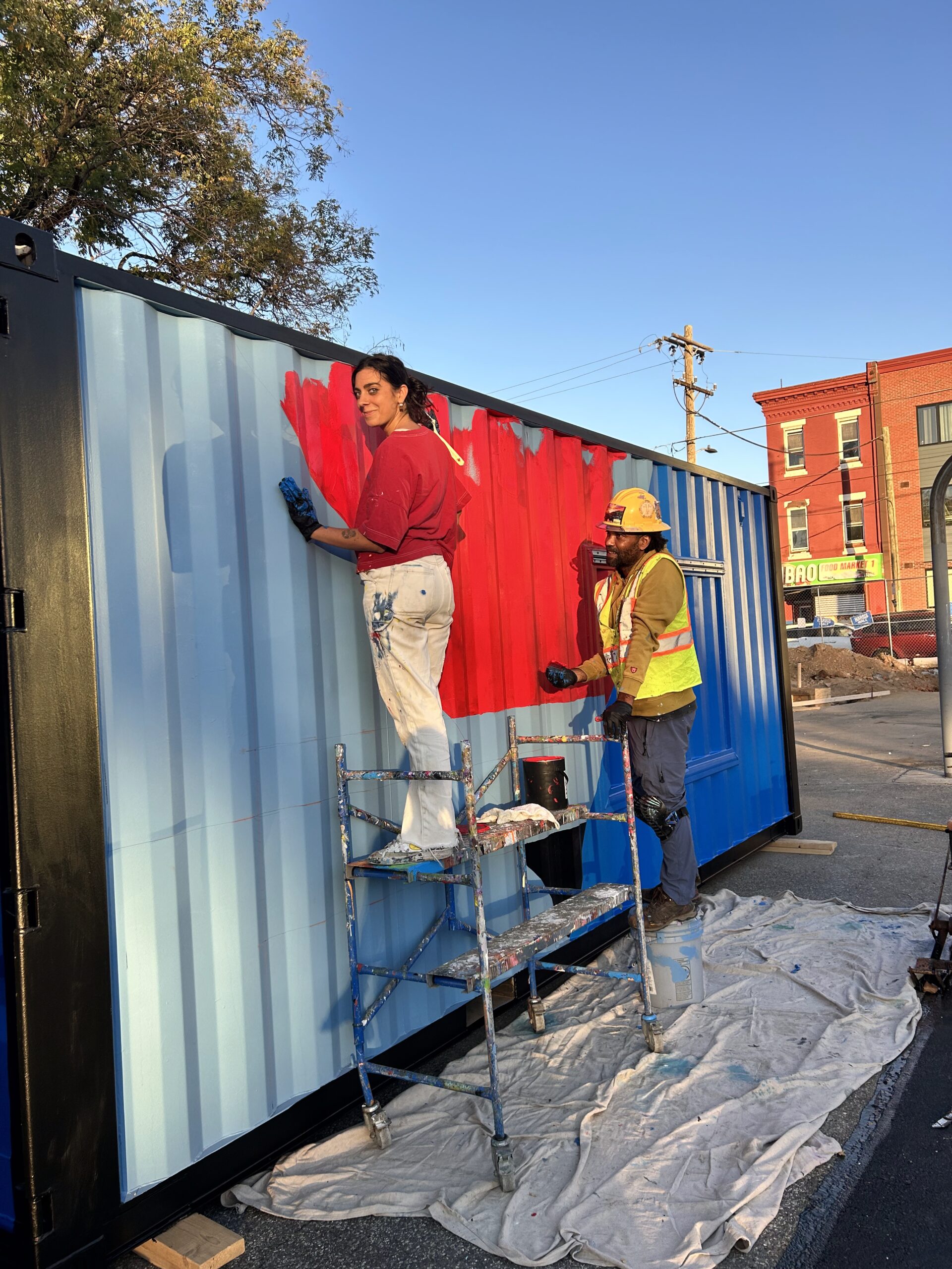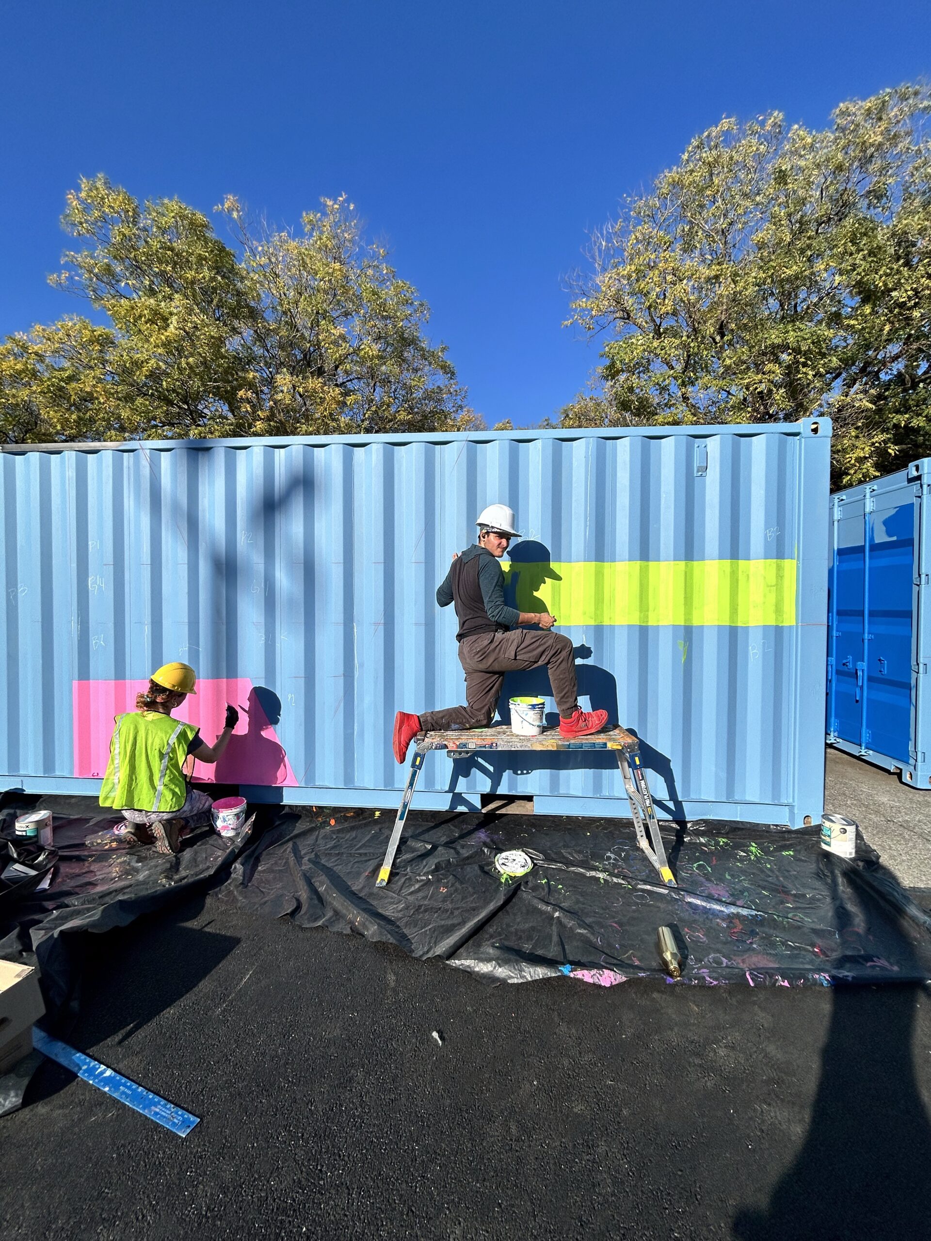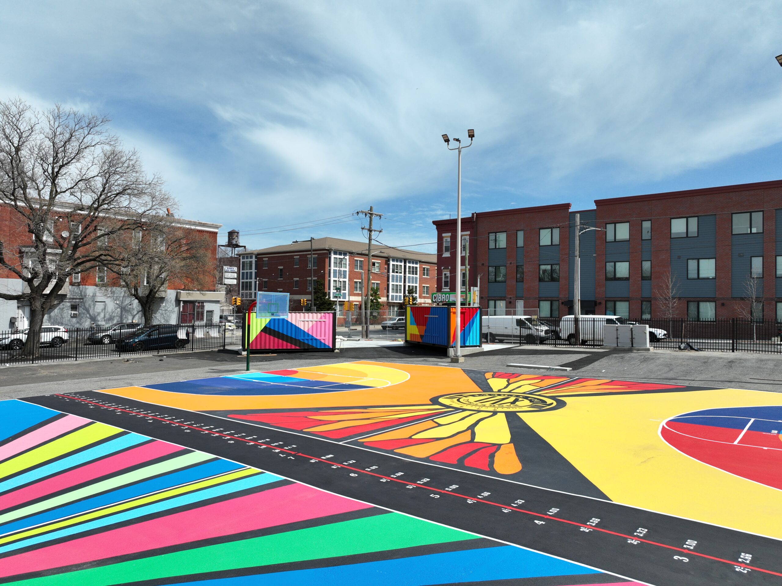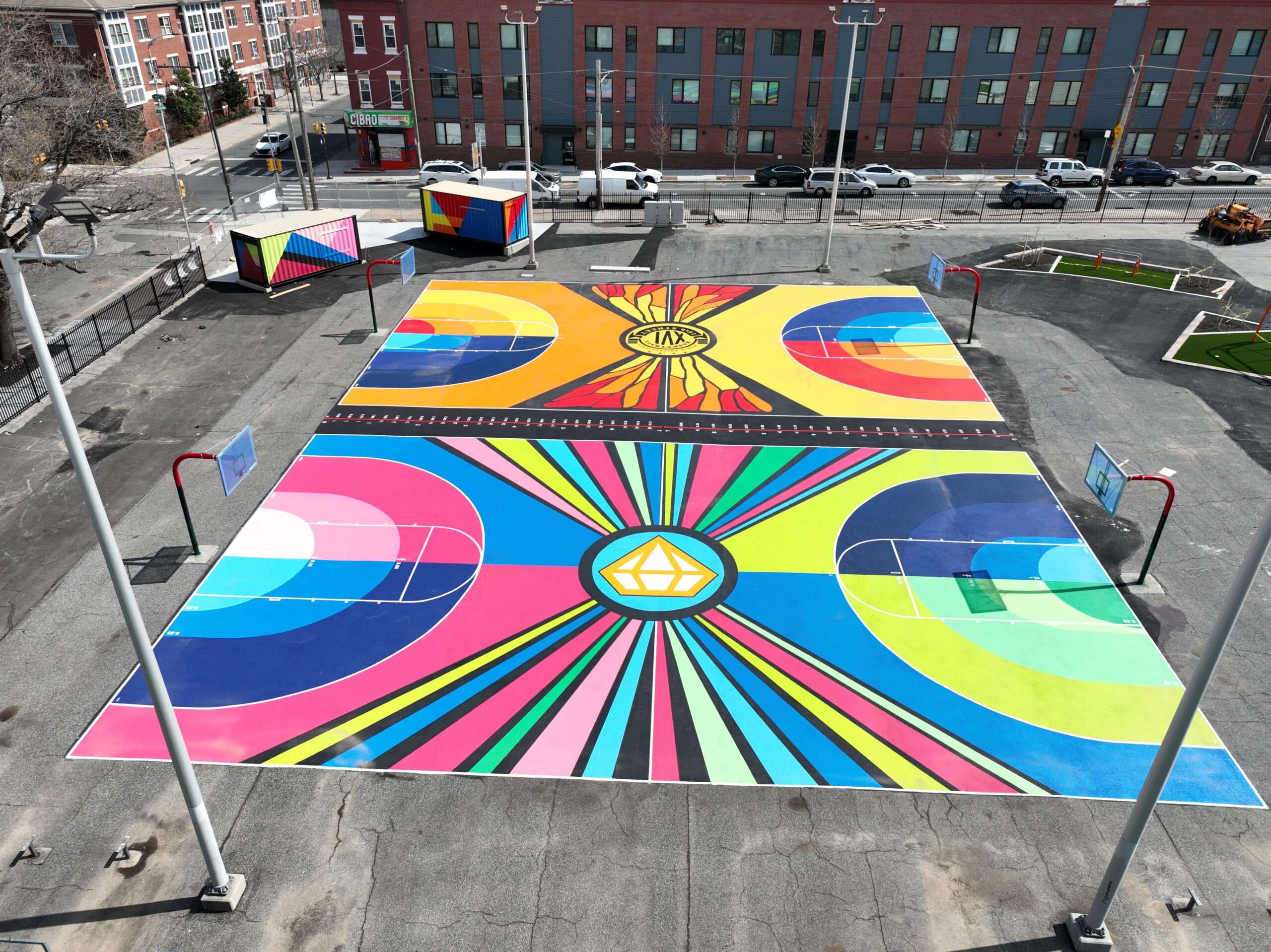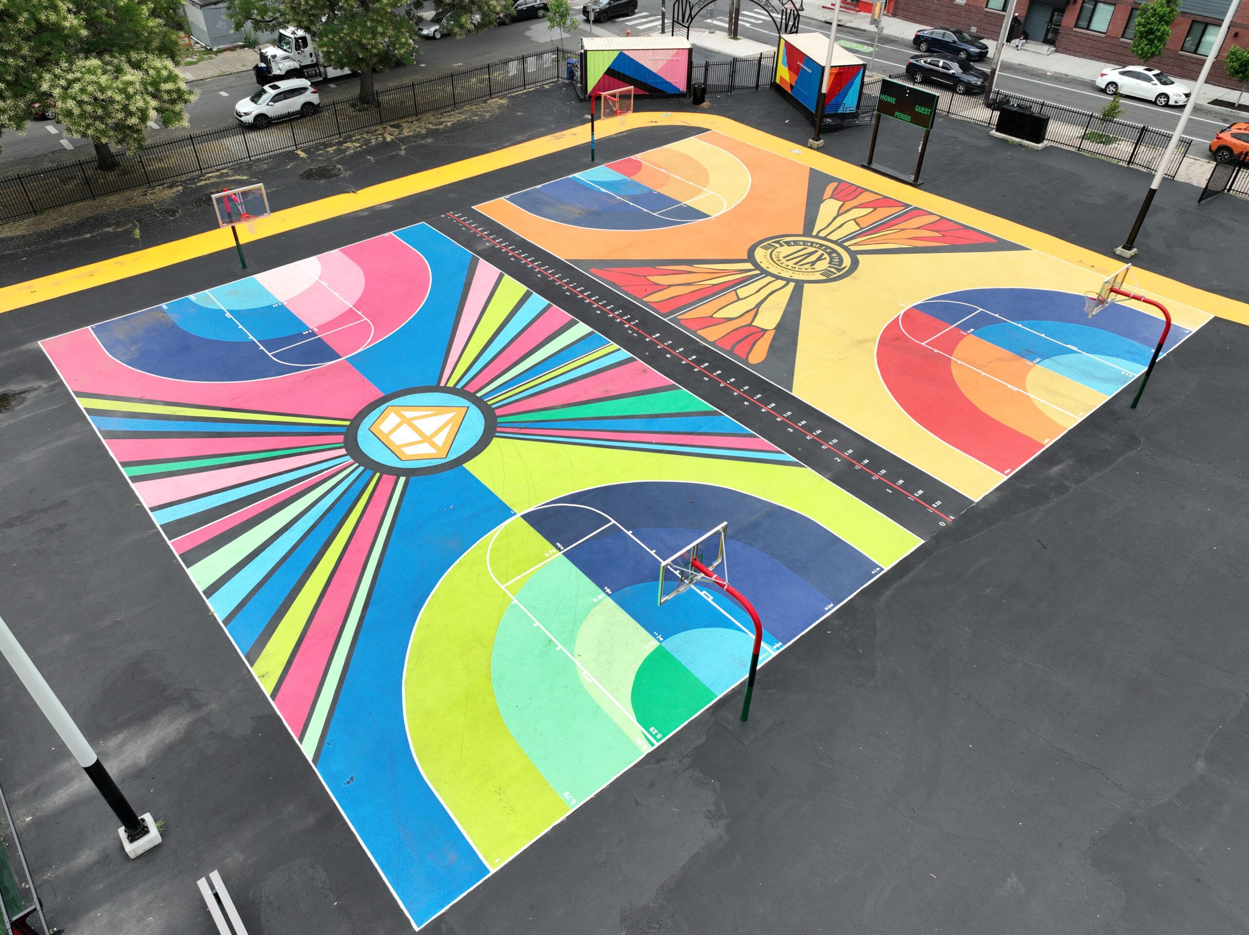 After a four-year engagement process and community reviews, we painted basketball courts and shipping containers as part of a schoolyard beautification.