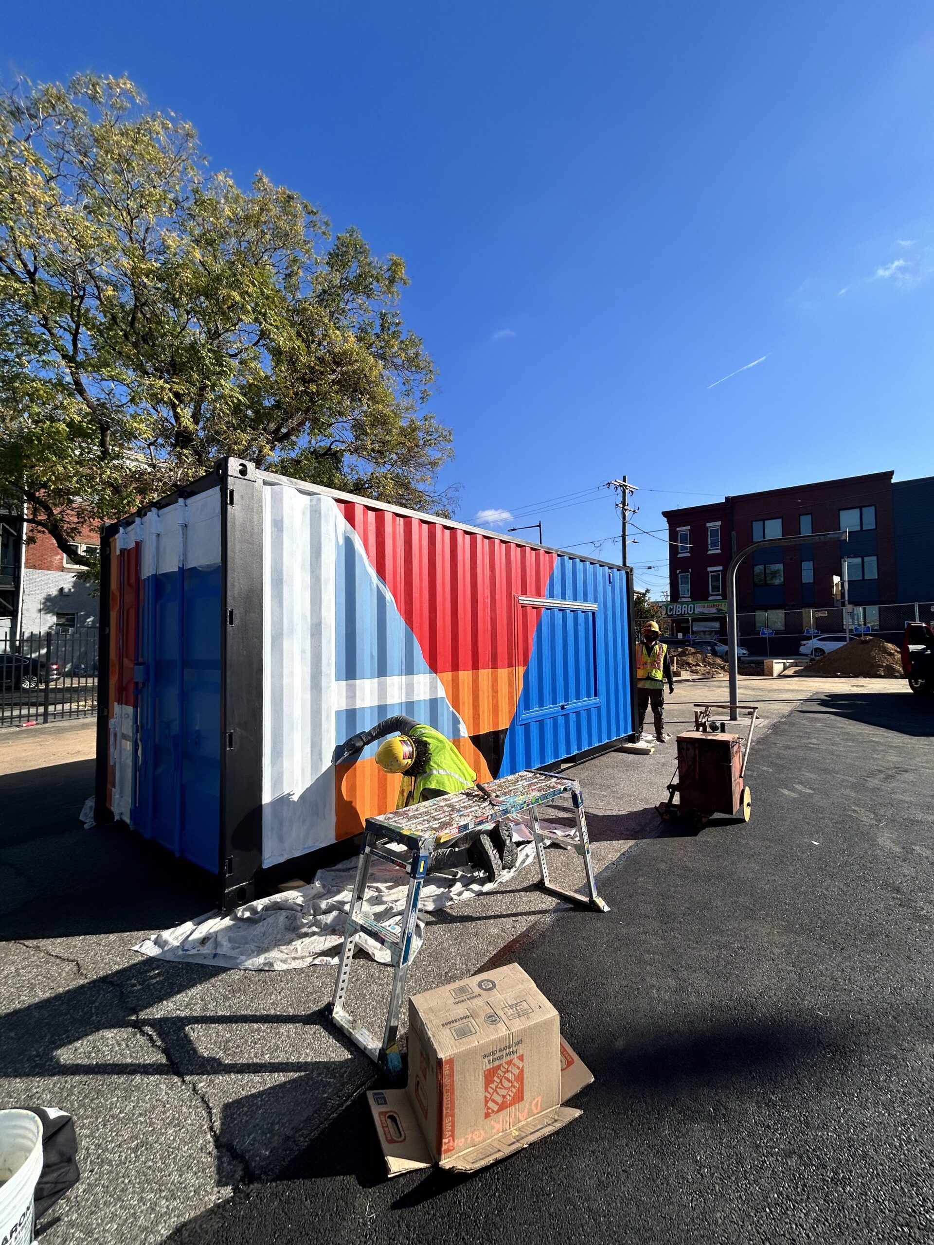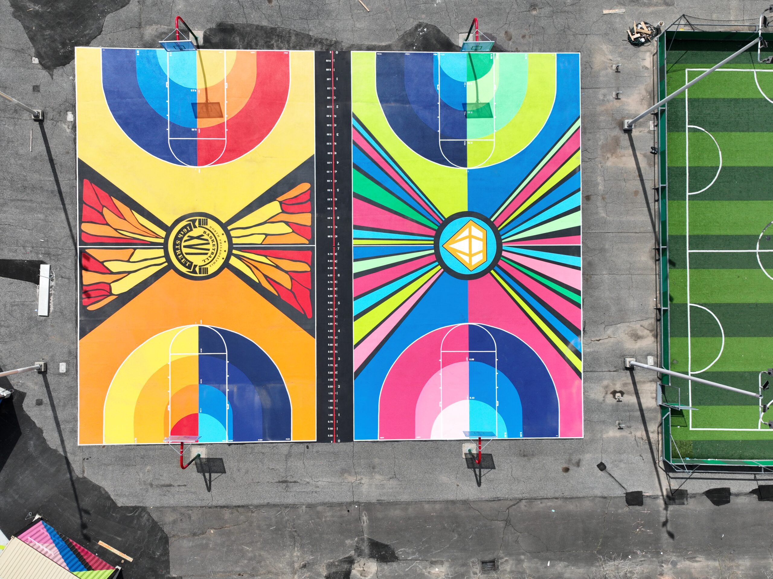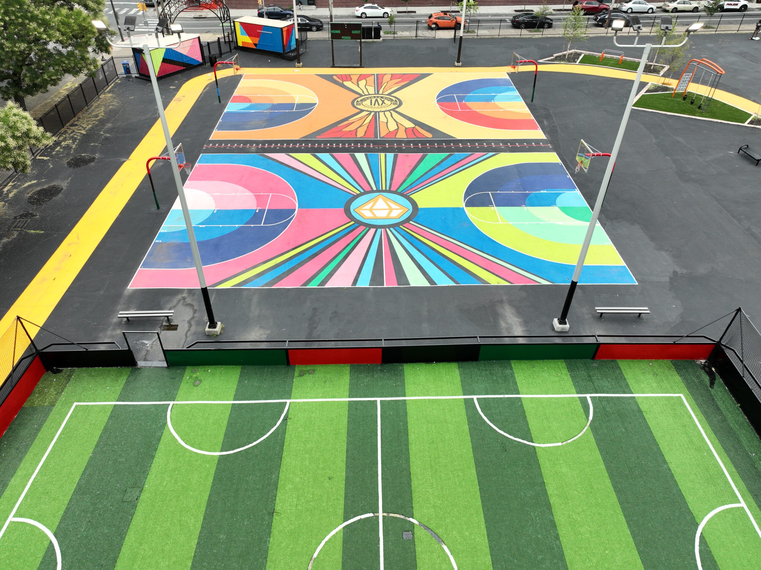After a four-year engagement process and community reviews, we painted basketball courts and shipping containers as part of a schoolyard beautification.